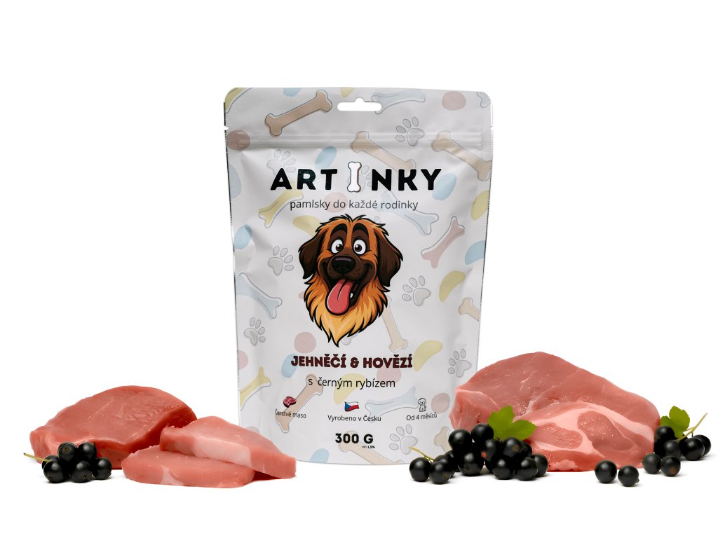 Artinky jsou kvalitní doplňkové krmivo pro psy, které spojuje vysoký podíl živočišných surovin, jednoduché složení a skvělou chuť. Receptura kombinuje jehněčí a hovězí maso, jemné zdroje vlákniny a černý rybíz pro podporu vitality a imunity.